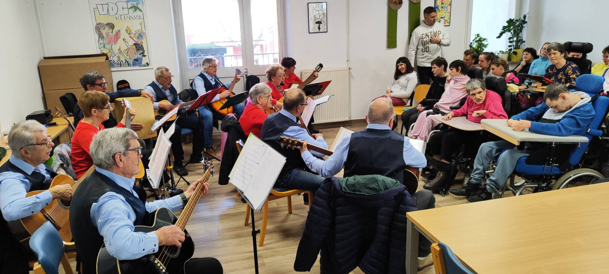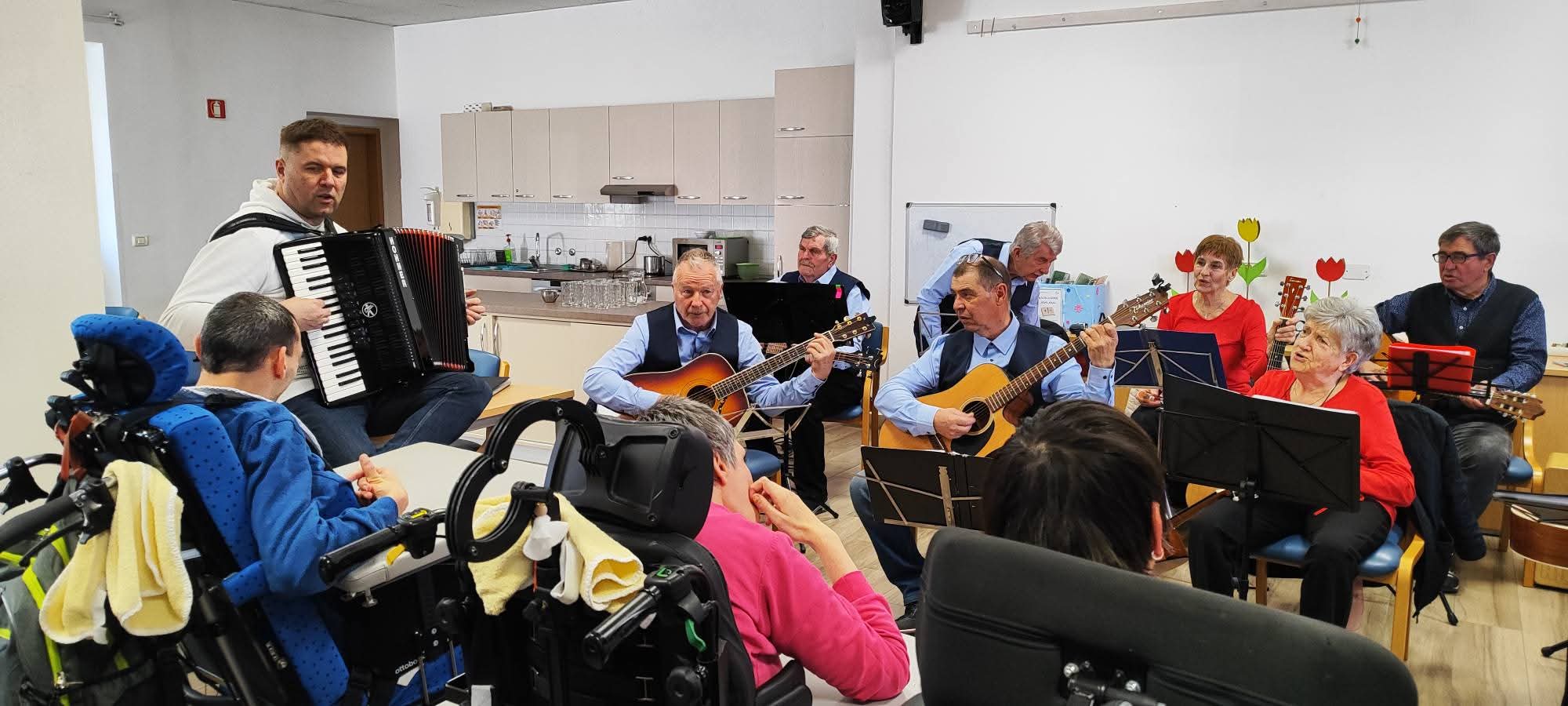 V sredo, 4. marca, nas je v enoti Vipava ponovno razveselila in navdihnila kitarska skupina Akordi, ki deluje v okviru Društvo upokojencev Ajdovščina. To ni bil njihov prvi obisk pri nas – Akordi so že pravi prijatelji našega VDCja in redni gostje, ki vedno znova prinesejo lepo glasbeno vzdušje, toplino in radost.